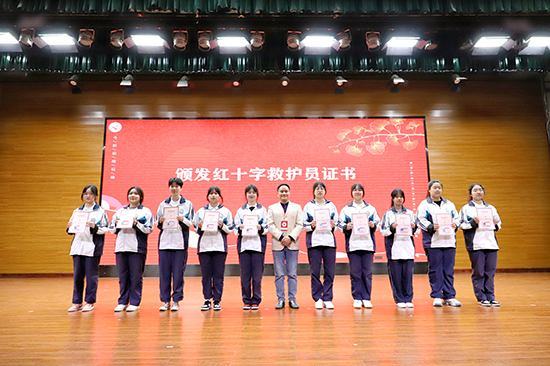 长兴县红十字会副会长王敏和长兴县人力资源与社会保障局副局长陈静分别为学生代表分别颁发《急救护理员》和《养老护理员》技能证书;长兴县卫生健康局党委委员胡伟华等领导为36名优秀毕业生颁发荣誉证书。