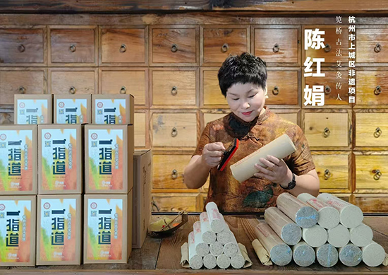第二步是研发产品。陈红娟以外婆留下的艾灸秘籍和诊疗心得为依据,在艾草的分摘、煮药浸艾、启晒、捣绒等步骤中坚持采用古法技艺,制作过程独具仪式感。正如陈红娟自己说的,她不仅要继承技艺,也要传承“心法”。她在制作之前会首先双手合十念诵《百字铭》以示心诚;然后将艾草的茎和叶分摘,将艾叶进行晾晒;再用“笕十八”药汤浸渍艾草细茎以增强艾条的药效及渗透力,同时制约艾火燥性;经此步骤所制的艾秆和艾叶一同放置三年后方可捣绒,且需按一定比例配置;然后选用专用的艾灸纸,经手工卷制包裹,将艾绒压制成一个截面直径为 7 厘米、长 23 厘米的大艾条,最后以鸡蛋清黏合纸缝,手法轻重全凭经验,难以明言。皇天不负有心人,在经过反复的实验并结合自疗实践体会,陈红娟终于成功研制出外婆记录中的第一根具有笕桥特色的艾条“扶阳固本灸”。有了特色产品,创立了自己的品牌,2014 年金秋,她的第一家“一指道艾灸堂”在杭州九堡街道丽江公寓内一个很小的门面里顺利开张。