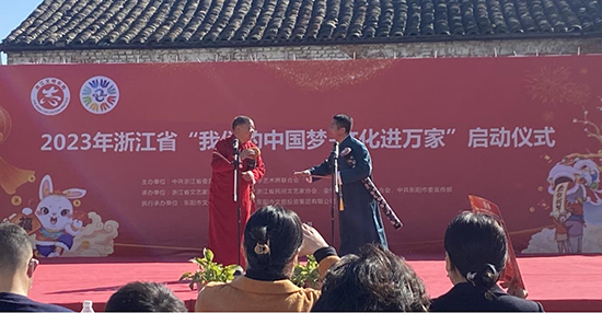 当他了解到东阳道情的生存现状后,更坚定了学习这门技艺的决心,毅然决定拜吴洵梅为师,踏上从事东阳道情之路。他从最基础的拍道情筒、打竹节开始,再到记背唱词,从简单的滩头戏开始到长长的戏剧唱本。拳不离手,曲不离口,一切都从零开始,他要每天重复枯燥的练习,还要下力气记背唱词,其中付出的艰辛与汗水是外人难以想象的。更为关键的是,他的选择起初没有得到家人的支持,认为道情这个行当不能养家糊口,学起来也没什么用。是他的炽热追求与刻苦执着慢慢感化了家人。择一业而终其一生,弘扬道情文化是他的初心,更是他一生的使命!