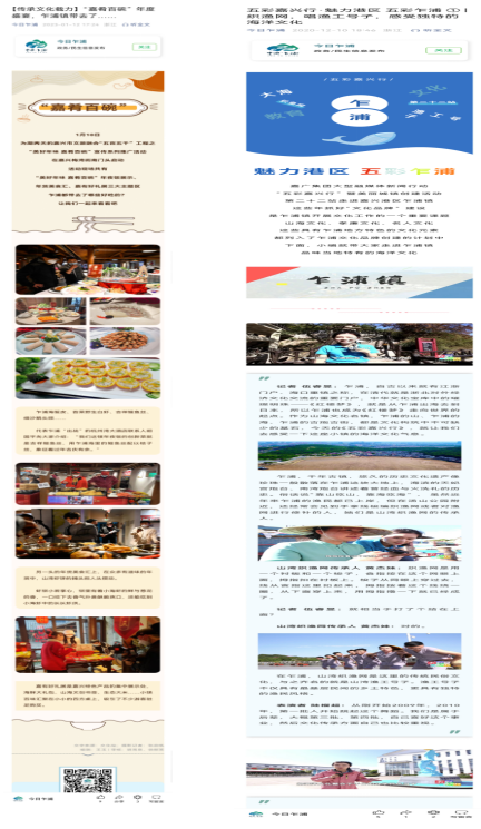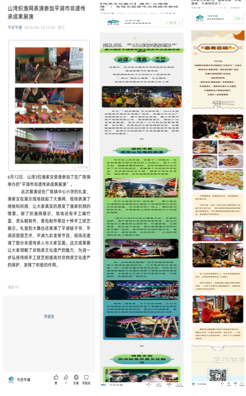 9.报道颇多:山湾非物质文化遗产在今日乍浦的微信上拥有众多的报道,如:“五彩嘉兴行 魅力港区 五彩乍浦”——织渔网,唱渔工号子,感受独特的海洋文化,山湾织渔网表演参加平湖市非遗传承成果展演,走进校园“渔业文化 乡土情怀”大讲堂活动,遇见“山海情缘”专场文旅夜市点亮城市夜经济,“渔”你“童”享,虾味无穷”做虾饼活动等等共20余篇报道。
