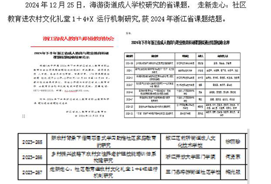 多年来,以点带面、点面结合,以《“初心接力”学习馆》为学习体验基地,发挥海游街道社区学校的教育主阵地作用开展初心接力学习,创建有标识度、美誉度和知名度的初心接力学习教育品牌。自2017年开馆以来,学习不断创新突破,品牌效应日益凸显,深受各单位居民的青睐,每年预约报名人数火爆,年学习超两千人次,坚持科研引擎,依托思政教育指导教学名师工作室,编印《“初心接力”学习课堂系列》和《“初心接力”学习通识读本》等思政读物,以及科普读物,立项或结题6项各级各类课题和资源建设项目。“初心接力”学习实践基地获评台州市初心接力学习教育实践基地。成立台州市初心接力学习教育指导教学工作室、台州市初心接力学习教育研究重点实验室、台州市初心接力学习教育联盟等。其中具有代表性的如2024年浙江省课题结题.走新走心:社区教育进农村文化礼堂1+4+X 运行机制研究、《初心系列趣课堂》获评省教育培训品牌项目,成功打造了社区思政素质教育新“范式”。