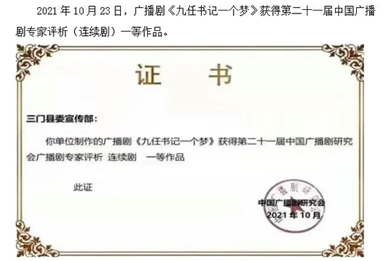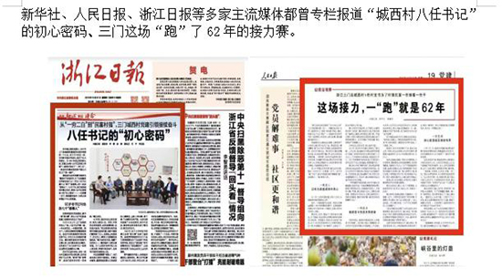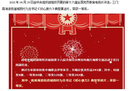 由中央组织部组织开展的第十六届全国党员教育电视片观摩交流活动,讲述三门县海游街道城西村九任书记故事的《初心接力》荣获全国党员教育电视片一等奖。海游街道城西村自1957年建立村党支部以来,九任党组织书记不忘初心,一任接着一任干,把党的组织优势转化为乡村治理效能,城西村从“一穷二白”向“村强民富”华丽蜕变,成功打造了新时代党建引领乡村振兴范本。曾经吃穿都发愁、需要翻身的“翻身村”,成为“浙江省小康示范村”,集体经济年收入上千万元,年人均收入8万多元。2021年建党100周年,城西村党委获评“全国先进基层党组织”。第九任书记章国进代表村党委进京领奖,受到习近平总书记等党和国家领导同志的亲切会见并合影留念。