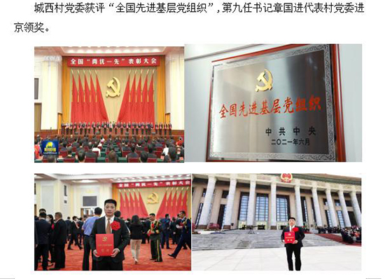 1957年,城西村党支部建立,自章正合担任首任书记以来62年,九任书记不忘初心,牢记使命,一任接着一任干,带领村民,发展生产,摆脱贪困,走向富裕,同奔小康。老黄牛书记章正合;改革先锋书记金积贵;智多星书记章以齐;加减书记叶加法;自拆书记章宏将;三让书记章宏军;三改书记章平;拼命书记章以家;初心接力书记章国进。