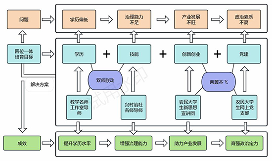 (一)提出“四位一体”模式,明确领雁培育目标。“领雁工程”采取全域教育理念,以促进人的全面、多维协调发展为导向,创新了“党建引领+学历教育+技能提升+创新创业”的“四位一体”乡村人才“螺旋式”培养模式,探索出了“导师帮带,线上与线下、理论与实践、课堂与课外相结合”的“一导三结合”教学模式,构筑起个性、多元、开放、人本的协同育人新体系。