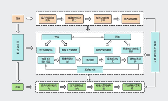 为了提升领雁学员的实战能力,学校探索开展现场把脉问诊式教学,现场问诊实践教学活动采用“双师+两表+五步教学法”,教学工作室名师与兴村治社实践导师参与讨论教学方案表的制定,以梳理(发现)问题、现场调研诊断、讨论分析、提出解决方案、总结反思提升五步教学法开展。该教学方法以农民大学生自己乡村治理现实问题为导向,组织学生对提出的问题进行讨论和分析,共同探讨解决方向,促使学生将所学知识学以致用,有效提高农民大学生实践治理能力和创新创业能力。