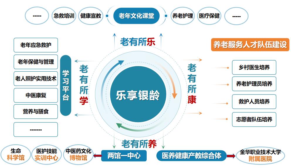 1.打造医养健康产教综合体。金华职业技术大学附属医院按照二级综合性医院标准建设,开放床位350床,为老年人的健康保驾护航。