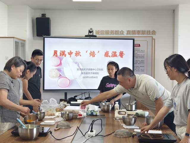 10月6日,中秋佳节,安吉县社区教育学院天子湖分院为天子湖镇卫生院医护人员举办法式马卡龙烘焙培训,以甜蜜手艺传递节日祝福,近 20 名医护人员在专业指导下体验烘焙乐趣。