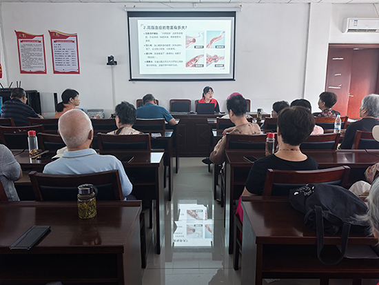 进入 “高脂血症的危害” 讲解环节,朱云老师通过图文结合的方式,直观展示高脂血症对血管的损害过程 —— 多余的脂质沉积在血管壁形成斑块,如同 “血管里的小石头”,长期积累会导致动脉粥样硬化,进而引发冠心病、脑梗死、脑出血等严重疾病。“很多人觉得血脂高没症状就不用管,这是大错特错!” 朱云老师强调,高脂血症被称为‘无声的杀手’,早期无症状但危害持续,尤其是中老年人、肥胖人群、有家族遗传史的居民,更要定期检测血脂。同时,她还分享了高脂血症的预防方法,包括控制高油高糖饮食、每周坚持 150 分钟中等强度运动、戒烟限酒等,建议居民根据自身情况制定健康管理计划。