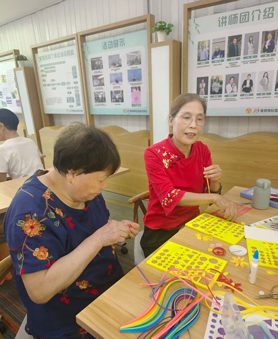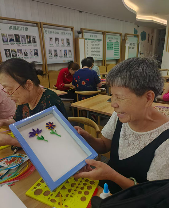 青荷苑社区晓荷书房里的盘衍纸课堂上,气氛同样热烈。上城区社区好老师叶莉囡老师细致讲解着盘衍纸的卷曲、粘贴技巧,展示着精致的成品。老人们小心翼翼地拿着衍纸笔,将彩色纸条卷成一个个基础部件,再组合粘贴成花朵造型。“这活儿看着简单,实则要细心,做好了特别有成就感!”邵阿姨举着刚完成的衍纸作品,兴奋地向同伴展示,指尖的温度让彩色纸条绽放出别样光彩。