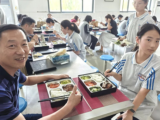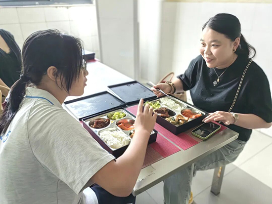 会后,家长们走进食堂,和孩子们共进午餐。他们围坐在一起,聊聊学习生活、尝尝食堂美味,现场氛围温馨而快乐。