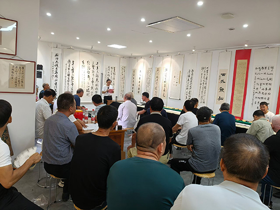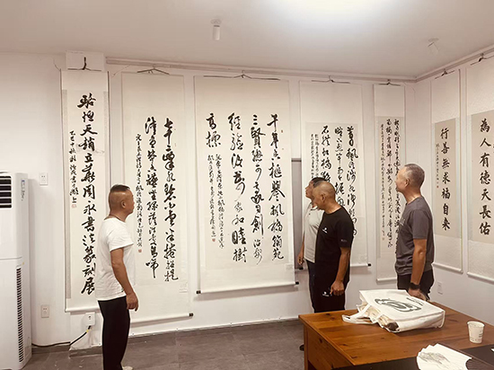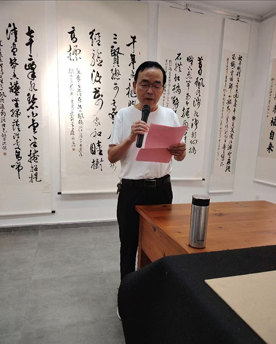 开幕式简短而庄重,由枫江书画社社长魏仁虎主持并致辞。他回顾了书画社精心打造的“五一展、国庆展、年终迎春展”三大展事,着重强调“以展促创、以展促学”的核心理念,指出这一理念持续激发着社员的创作活力与热情。魏仁虎表示,此次展览既是枫江书画社推动本土艺术传承与创新的成果缩影,更离不开三位艺术家的践行与引领,称其为“内容丰富、异彩纷呈的艺术盛宴”。同时,他还对2026年迎春书画展及五一联展的筹备工作提出具体要求。开幕式后,骆恒天分享了个人创作感悟与对书艺的执着追求,三位艺术家更现场导览展品、切磋交流,进一步提升了现场的艺术鉴赏氛围。
