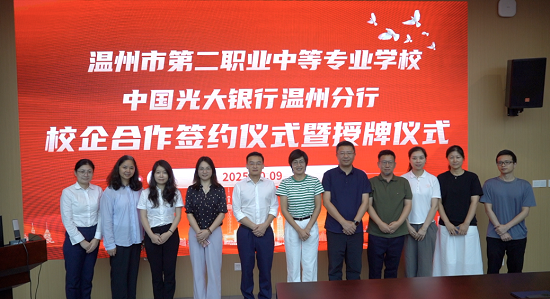 10月9日下午,秋高气爽,硕果盈枝。温州市第二职业中等专业学校与中国光大银行温州分行“银校”金融服务合作签约暨授牌仪式在东校区实训楼隆重举行。双方代表齐聚一堂,共同见证这一深化校企合作、共育金融人才的重要时刻。