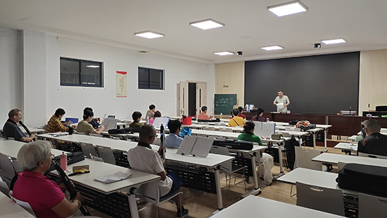 10月13日上午,安吉县社区教育学院昌硕分院(简称昌硕成校)热闹非凡,老年电吹管初级班培训正在进行中。来自昌硕街道各社区的二十名电吹管爱好者齐聚一堂,在音乐的氛围中开启了学习之旅。