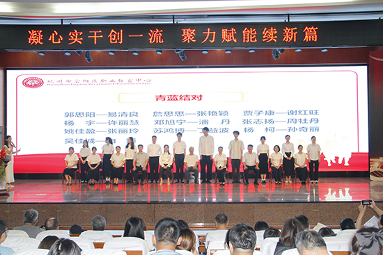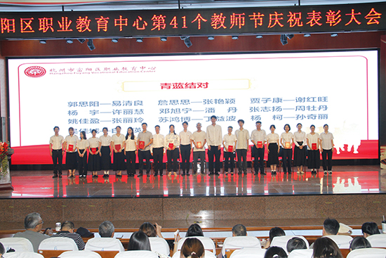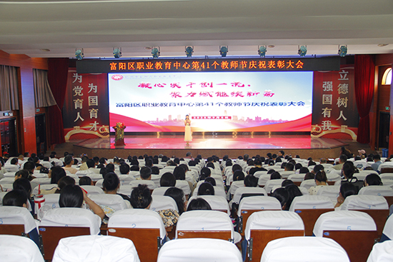 杭州市富阳区职业教育中心于9月5日中午,在富阳区职业教育中心综合报告厅举行第41个教师节庆祝表彰大会。大会以“凝心实干创一流,聚力赋能续新篇”为主题,致敬平凡中的伟大,礼赞讲台上的光芒。本次会议由张宇卓老师主持,大会在雄壮的国歌声中拉开帷幕。