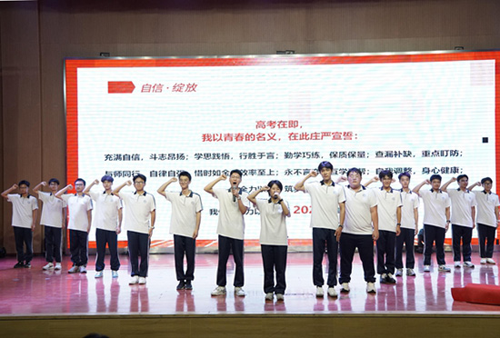 以同心筑力量,以祝福伴前行。“我以青春的名义宣誓:不负父母期盼,不负老师厚望……”各班领誓同学带领全体高三学子起立举拳,铮铮誓言回荡在会堂,彰显着高三学子备战高考的坚定决心。随后,身着红衣的高三任课教师团队登台宣誓,承诺“殚精竭虑、陪伴护航”,师生同心的画面令人动容。