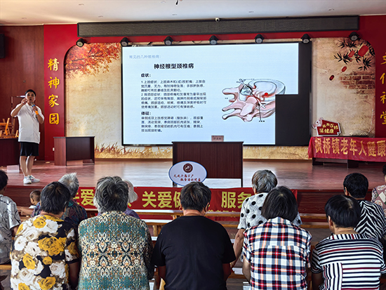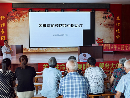 随后,钟强以《颈椎病的预防和中医治疗》为题开讲,从“什么是颈椎病”“颈椎病分型”“预防方法”“治疗手段”“小针刀治疗常见问题解答”五个维度,全面解读颈椎病知识。他结合中西医视角分析病因,既提及西医关注的“颈椎退行性变”,也阐释中医所说的“风寒湿痹、经络受阻”,让老人对病因有更立体的认知。当钟强描述颈椎病“眩晕头痛、耳鸣耳聋、失眠多梦、肢体麻木、面红目赤,常伴舌红少津、脉弦”等症状时,台下老人深有感触,纷纷表示“这些痛苦太熟悉了”。针对预防,他提出“抬头做人”的实用建议——时刻注意头、颈、肩、背姿势,避免长时间低头导致颈椎疲劳;同时提醒“保持饮食健康,远离烟酒”,还分享中医养生知识,指出“胡桃、萸肉、生地、黑芝麻等食材有补肾髓的作用”,适合日常调理。作为“小针刀”疗法传承人,钟强还详细介绍了该疗法的“原理、优点、疗程及注意事项”。现场的金大爷听得格外认真,他分享道:“三年前我做了小针刀手术,到现在都没复发,效果特别好!”