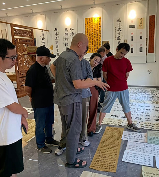 活动中,绍兴市书协副秘书长、绍兴书画院画师娄庆云现场示范写作,其用笔自然流畅,笔走龙蛇,如行云流水般洒脱。各位爱好者专注地观察其排版用笔,不放过任何一个细节,娄庆云也热情耐心,有问必答。此外,专家们还对现场的书法作品进行了专业点评,让书画社成员们获益匪浅。