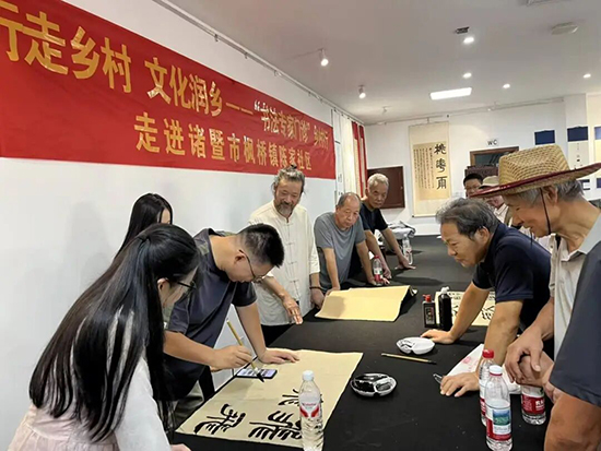 绍兴市文联党组成员、副主席赵飞霞,绍兴市文联副主席、书协主席陈建明,诸暨市文联主席杨国忠等领导和嘉宾,以及枫桥镇枫江书画社、老莲书画社的书法爱好者参加了此次活动。活动由诸暨市文联副主席兼书协主席杨曙主持,诸暨市枫桥镇经发办主任钱春天致辞,绍兴市文联党组成员、副主席赵飞霞发表讲话。随后,陈建明与陆乐向陈家社区赠送了宣纸、墨盒等书法学习用品以及书法作品集和理论书籍,受到老莲书画社成员的热烈欢迎。