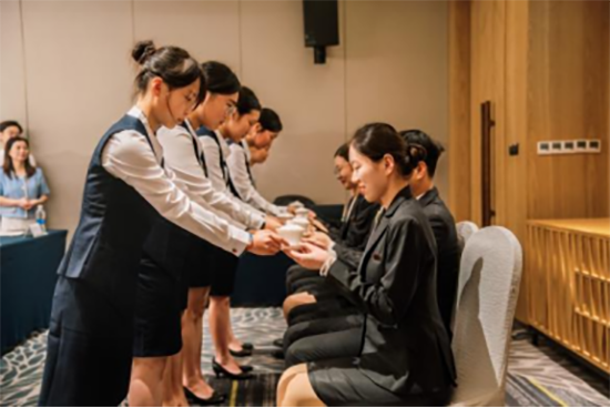 2025级新生代表身着专业制服,向企业师傅恭敬奉茶,一杯杯热茶承载着对前辈的敬意,也象征着同学们开启了职业探索的新旅程。