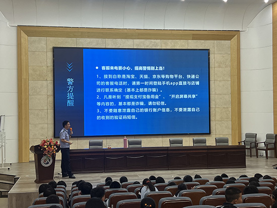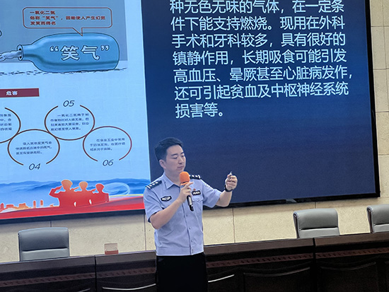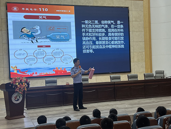 谈及预防电信诈骗,魏警官精准剖析了学生群体易遭遇的诈骗套路;而在识毒禁毒环节,他更是带来派出所近期收缴的“笑气”实物样品现场展示,严肃警示:“这看似是‘娱乐’用品,实则是新型陷阱,大家的好奇心绝不能碰触法律红线!”整场讲座互动感十足,鲜活的案例让每一位学生都沉浸其中,引发深度思考。