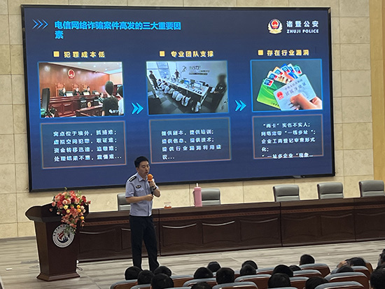 10月17日下午,诸暨市枫桥镇初级中学报告厅内座无虚席,一场专为七年级全体学生打造的健康大讲堂如期开课。本次活动特邀枫桥派出所魏越锋警官主讲,以《迈好青春的每一步》为题,围绕“预防校园欺凌”“预防电信诈骗”“识毒禁毒”三大核心主题,为学子们送上一堂生动且深刻的安全必修课。