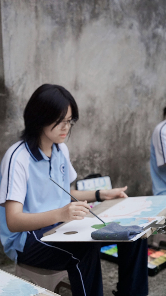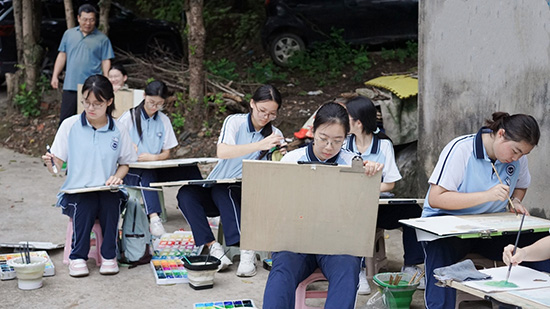 色彩老师黄舒曼说,户外写生最能锻炼学生的观察力和表现力,要学会捕捉转瞬即逝的光色变化,这是艺术成长的重要一课。比如让同学们观察山林的绿叶在夏末的强光下和初秋的质感是不同的,希望同学们通过写生,能够理解季节转换中色彩的微妙变化。