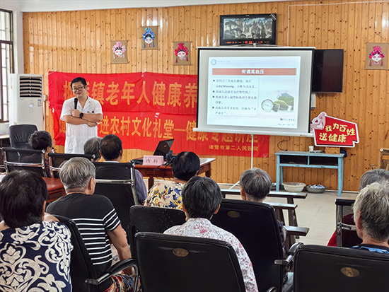 随后,骆一舟开讲《中风—高血压》,用一组组数据敲响健康警钟:“全球高血压患者达15亿,每年有700万人的死亡与高血压相关”“我国25至34岁年轻男性高血压患病率已高达20.4%”。这些数据让以高血压高发群体为主的老人们深感震撼,即便稍感疲惫,仍全神贯注地聆听。结合临床案例,骆一舟系统讲解了高血压的严重后果、致病原因、与生活方式的关联及防治原则。他指出,饮酒过量、缺乏运动、高盐高糖高脂饮食等是诱发高血压的主要因素,笑着调侃其为“富贵病”,引得老人们会心大笑,纷纷表示认同。在预防与治疗方面,他通过饮食图片给出具体建议,倡导不吸烟、限饮酒、适量运动的健康生活方式,并强调高血压患者需长期坚持改善生活习惯、定期监测血压,且必须接受规范化的药物治疗。讲座在“祝大家身体健康”的诚挚祝福中收尾。