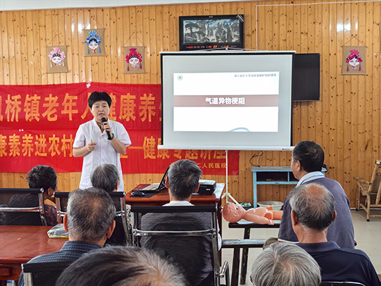 卓周平以《气道异物梗阻》为题,围绕“是什么、怎么认、如何救、要牢记”四个维度展开讲解。她首先明确,气道异物梗阻是指呼吸道任一部位被异物阻塞,导致呼吸不畅甚至中断的危急情况,并细数了进食说话、脑部疾病等七种常见诱因。当讲到日常生活中频发的“打嗝”等场景时,台下老人们看着图文并茂的课件,纷纷点头表示深有体会。为帮助老人规避风险,卓周平特别列举了高风险物品,食物类如果冻、整颗葡萄、带骨肉类等,物品类如别针、硬币等,提醒老人们照看孙辈时务必格外留意。她还清晰区分了“不完全梗阻”与“完全梗阻”的不同表现,并现场演示了咳嗽自救、背部叩击、腹部冲击法(海姆立克法)及胸部按压法四种处置手段。其中,对关键的海姆立克法,她邀请老人上台配合示范,老人们踊跃参与,希望多掌握一项急救技能以备不时之需。最后,卓周平强调,急救处理后仍需及时拨打“120”,交由专业医护人员处置。