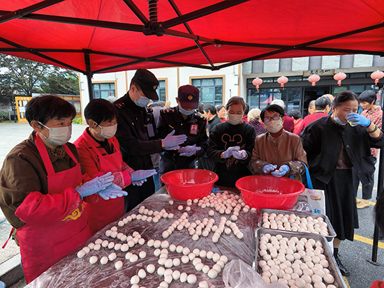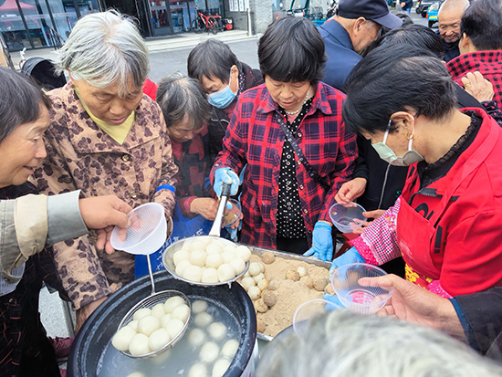 趣味互动专区设置两大特色活动:一是“福气滚滚来”投乒乓球游戏:游戏操作简单、趣味性强,适配各年龄段长者,既能活跃现场气氛,又能锻炼手眼协调能力。 二是“团圆甜蜜蜜”驴打滚现场制作分享:邀请村内厨艺志愿者与工作人员协作,现场准备汤圆粉、黄豆粉、芝麻粉等食材,手工制作驴打滚。以“团圆团子”寓意邻里和睦,通过美食分享传递“家”的温暖,弘扬传统文化。