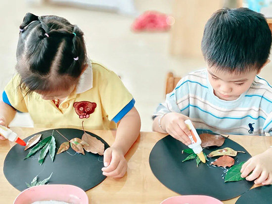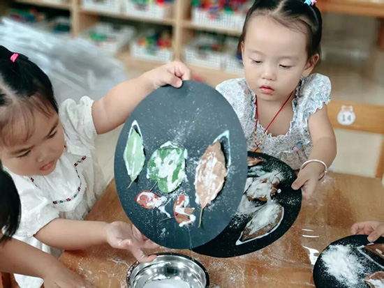 霜降过后,园内树叶换上五彩盛装。老师和孩子们收集落叶,共同创作“霜降树叶画”:用面粉撒在各色落叶上,形成万林尽染的美景,一片片普通的叶子在孩子们的巧手下焕发生机。这场创作不仅留住了秋天的美好,更让孩子们在触摸叶片纹理、搭配色彩的过程中,直观感受霜降时节的自然之美。