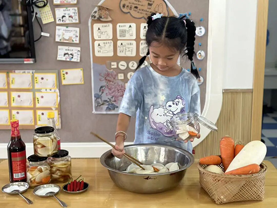“霜降腌萝卜”是刻在传统里的生活智慧。活动伊始,老师带着新鲜萝卜抛出问题:“萝卜长在土里还是树上?”“我们吃的是萝卜的根还是叶子?”带着好奇,孩子们走进“快乐农场”亲手播下萝卜种子,期待泥土里的惊喜;回到教室后,大家围坐在一起,洗萝卜、切萝卜、撒盐腌制,看着清脆萝卜慢慢入味。这不仅是一次民俗美食制作,更让孩子们在实践中懂得了“顺应时节”的生活道理。