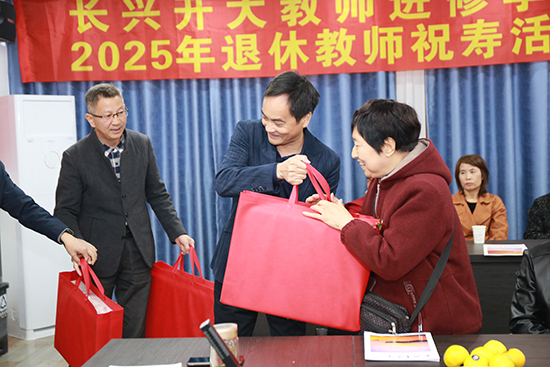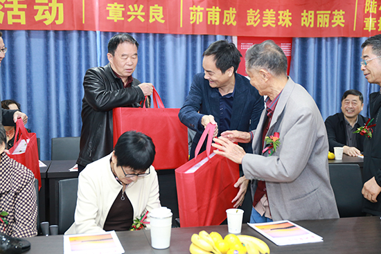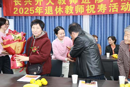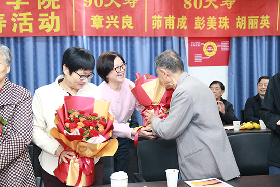 学院党总支书记章小杰、副书记孙甫永和退教协会会长徐金昌为寿星们送上鲜花和纪念品。