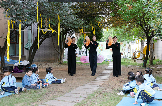 10月28日上午9时,活动正式拉开帷幕。开场环节“萌力全开VS酷炫银发”精彩纷呈,大一班幼儿手持重阳主题物品自信走秀,稚嫩步伐尽显活力;浙江老年开放大学诸暨学院的学员们不甘示弱,一曲《惊鸿舞》舞姿曼妙,经典红歌联奏旋律悠扬,功夫扇表演更是刚劲有力,赢得现场阵阵掌声。此外,大三班的“长征路上”运动展示、中班的生活剧《一日生活中的小惊喜》、大六班的音乐游戏“照镜子”以及中六班幼儿的重阳手势舞《九月九重阳到》,将活动氛围推向高潮,展现出两代人不同的风采与活力。