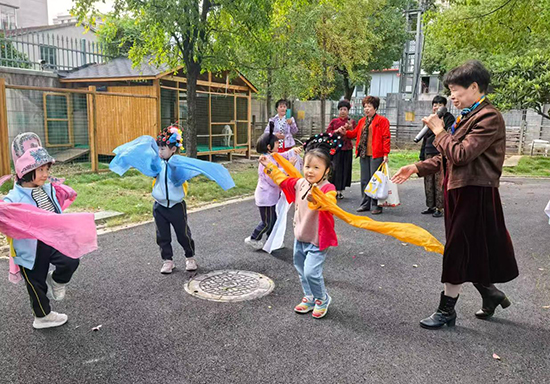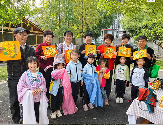 9时50分,“暖心时光:共玩道地”环节开启。老年教育学员们按提前分组,分别前往相应班级,与孩子们亲切互动。初识环节中,学员们主动表达需求,孩子们礼貌回应,快速拉近距离;道地共玩时,爷爷奶奶现场展示越剧演唱、乐器演奏、太极功夫扇等拿手本领,孩子们好奇体验,还热情邀请长辈参与民间游戏,欢声笑语不断;活动尾声,孩子们将提前准备的礼物送给爷爷奶奶,附上真挚的节日祝福;学员们则为孩子佩戴重阳节特制徽章,小小的徽章承载着跨代情谊,为活动画上圆满句号。