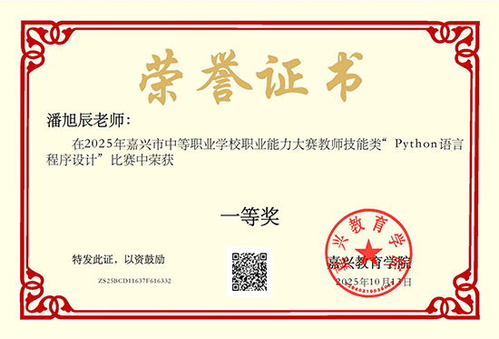 近日,2025年嘉兴市中等职业学校职业能力大赛教师技能类“Python语言程序设计”项目比赛在嘉兴技师学院圆满落幕。经过紧张激烈的角逐,嘉善信息技术工程学校潘旭辰教师凭借深厚的编程功底、扎实的教学基本功与创新的课堂设计,从全市众多参赛教师中脱颖而出,荣获一等奖(第二名),成功晋级省赛!
