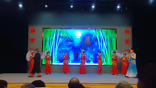 晚会以融合传统与现代的文艺演出为核心,天荒坪成校老年学员成为亮点。葫芦丝班学员身着统一服饰,演绎《月光下的凤尾竹》等经典曲目,婉转音韵承载着对传统文化的坚守;歌咏班则献上歌舞《红梅赞》,以铿锵舞步与激昂歌声诠释革命精神,舞台光影间勾勒出“银龄风采”的生动画卷。此类社区文艺实践,呼应了全国重阳活动中“传统文化与现代元素创新融合”的节日理念,使尊老敬老内涵更具感染力。
