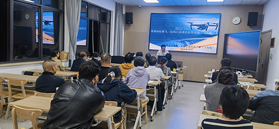 本期培训采用“理论学习+模拟实训+户外实操”三阶递进模式,课程体系科学完善,涵盖了无人机发展史、飞行原理、安全法规等理论基础,以及无人机设备组装、调试、基本飞行动作、航线规划等,注重理论与实践紧密结合。第一节课,专业讲师系统性地讲解了国家及地方关于民用无人机飞行的相关法律法规、空域申请流程以及飞行禁忌。他强调,“无人机不是玩具,每一次起飞都意味着责任”,让学员们从第一天起就树立牢固的安全飞行意识。讲师向学员们展示了一架实体多旋翼无人机用于讲解基本结构,“这是机臂、电机还有螺旋桨、电调以及云台……”讲师最后演示了最基础的的起飞与悬停,在座的学员无不被无人机技术深深吸引。