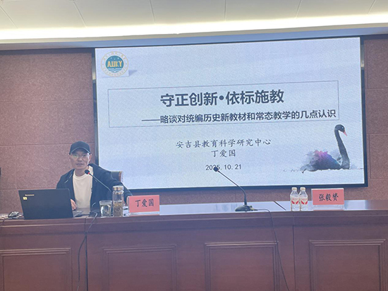 安吉县初中社会法治教研员丁爱国老师以《守正创新,依标执教——略谈对统编历史新教材和常态教学的几点认识》为题作讲座,丁老师围绕三大要点展开阐述:首先,介绍八上历史新教材修订的总体变化概况——专题史融入通史、课次精简合并以及各单元内容具体修订;其次,他强调教师需要关注近代史中相应的宏观认识和重点问题,帮助学生树立正确的唯物史观;最后,丁老师指出教师应依标执教,注重历史四大联系,着重培养学生学科思维。