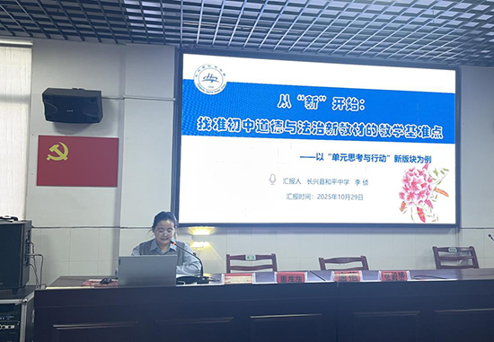 吕山中学周萍萍老师以《从“课堂”到“论文”:公开课的深度反思与论文转化的路径》为主题,从教师专业成长、教学实践优化、教研价值辐射三重维度,论证公开课转化为论文的可行性。周老师为参训教师凝练出“立体定论—回溯整理—建构谋篇—打磨润色”四步公开课转化论文的方法论,为教师实现教学研一体化提供范式参考。和平中学李侦老师以《从“新”开始:找准初中道德与法治新教材解读的教学基准点》作专题发言,从“明确板块构成和创新本质解码”到“凸显核心功能与板块价值锚定”双维度,指导参训教师把握初中《道德与法治》新教材迭代逻辑。