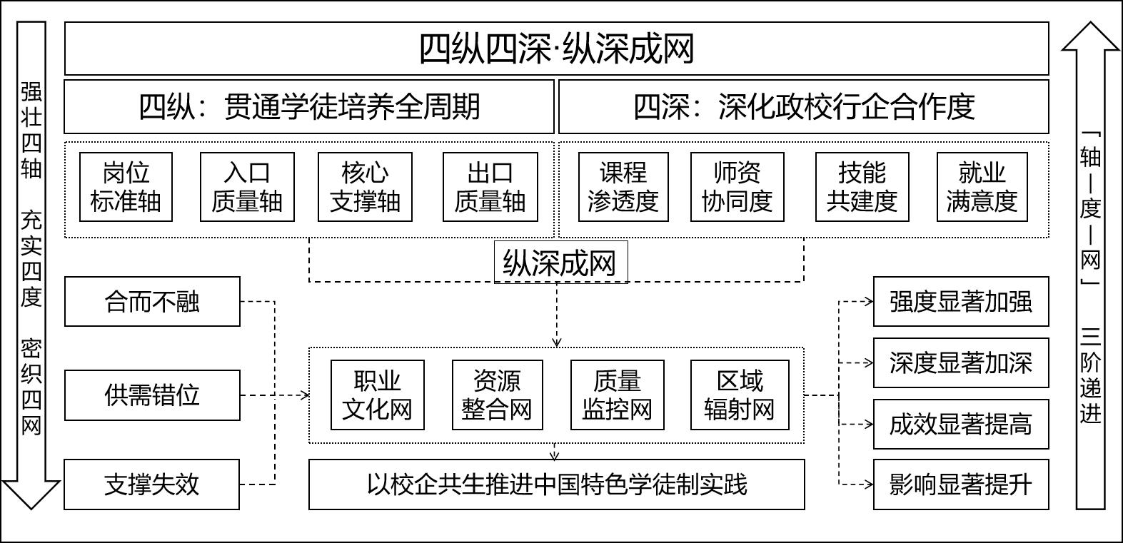 在“强壮四轴”夯基垒台、“充实四度”立柱架梁的基础上,密织“四网”,形成“轴—度—网”三阶递进,最终形成全方位、多层次的产教融合网络,疏解支撑失效痛点,以“四纵四深·纵深成网”的人才培养模式促进中国特色学徒制向纵深发展。