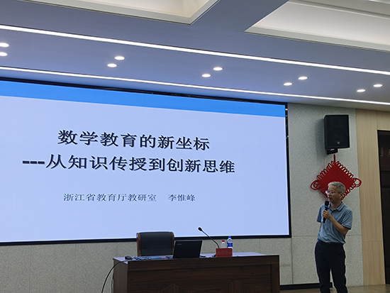 培训期间,浙江省教育厅教研室初中数学教研员李惟峰作主题为《数学教育的新坐标——从知识传授到创新思维》的专题讲座,李老师从创新思维培养的背景、创新思维培养的关键、创新思维培养的建议三个维度深刻阐述了创新思维培养的重要性、内容和路径,为参训教师从“知识传授”走向“素养教学”的转变提供了理念上的更新和实践上的引领。宁波市教育局教研室初中数学教研员杨一丽作主题为《理解课标 解构教材 赋能教学》的专题讲座,讲座从课标主要的突破、教材修订的主要方面、教学的思考等方面展开,同时结合课例分析让参训教师对课堂上如何让学生的思维得到生长与升华有了直观的感知,为研题提供方向和框架。湖州市教育科学研究中心初中数学教研员沈莹琪作主题为《让孩子学会学习:新课标下初中数学深度教学的设计与思考》的专题讲座,沈老师通过几个案例的分析让参训教师明白如何实现评价与教学的一致性并在教学中怎样实现高路迁移和深度教学,同时还强调数学教师一定要学会学习,要努力把我们的数学课上得更深一点、更有味道点,让孩子们学起来更轻松更愉快。