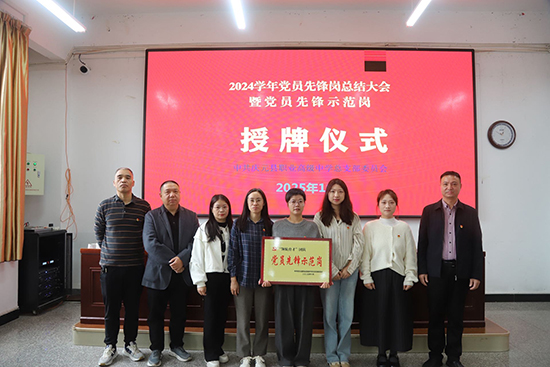 会上,校党总支书记范寿鹏首先对2024学年党员先锋岗工作进行全面总结。他充分肯定了过去一年各先锋岗团队在教育教学、专业建设、学生管理、服务保障等领域的辛勤付出与突出贡献,强调党员先锋岗作为学校发展的骨干力量,在引领师德师风建设、推动教育教学改革、破解发展难题等方面发挥了重要的示范引领作用。随后,大会举行了庄重的授牌仪式,范寿鹏为2024学年表现突出的7个党员示范岗团队逐一授牌,表彰他们在各自岗位上的实干担当与创新突破。这7个示范岗分别是:康旅先锋岗(负责人陈柳姣)、砥砺智电先锋岗(负责人周炉兴)、双高先锋岗(负责人耿翠)、智算先锋岗(负责人胡慧芳)、灯塔先锋岗(负责人蒋明)、保驾护航先锋岗(负责人胡世莲)、领航育才先锋岗(负责人练志华)。