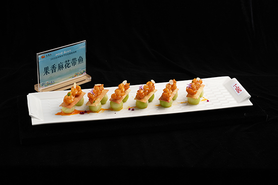 自选凉菜“果香麻花带鱼”创新地将带鱼去骨切条,编织成麻花状炸制,外酥里嫩。佐以橙汁、百香果熬制的酸甜酱汁,搭配杏仁脆片与蜜瓜球,果香清雅,所有元素皆可入口,风味别致。