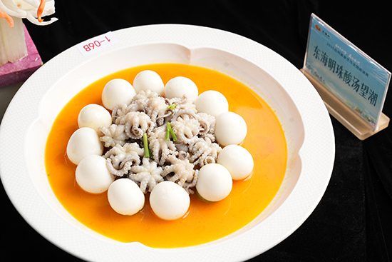 自选热菜“东海明珠酸汤望潮”将新鲜望潮经反复摔打提升韧性,配以手打鲈鱼丸,融入酸菜调制的酸汤之中,成品脆弹与鲜嫩兼具,酸辣开胃,尽显东海风味。