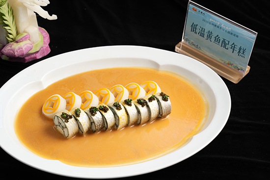 在150分钟的紧张比赛中,团队完成的四道作品,正是这一理念的杰出体现:规定作品“低温黄鱼配年糕”选用大陈岛黄鱼,匠心独运地去骨取肉,以菠菜包裹鱼柳,再用完整鱼皮卷制,通过低温慢煮技法锁住鲜嫩。搭配软糯年糕与自制家烧汁,口感层次丰富。