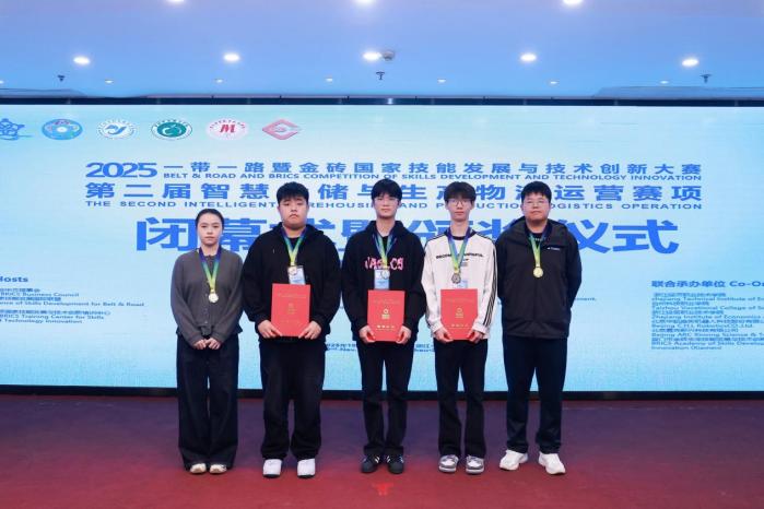 在赛事角逐中,教师组与学生组双线告捷。由吴雅婷、王铮两位教师组成的教师团队,凭借对智慧仓储运营逻辑的精准把握、智慧物流设备的娴熟操作,以及对赛题需求的高效响应,一路稳扎稳打,成功摘得教师组金奖;学生组方面,物流商贸专业的胡俊杰、黄志军与高俞范涵三位同学紧密协作,在高强度赛程中沉着应对挑战,将课堂所学与实训技能灵活运用到实际操作中,最终拿下学生组银奖。