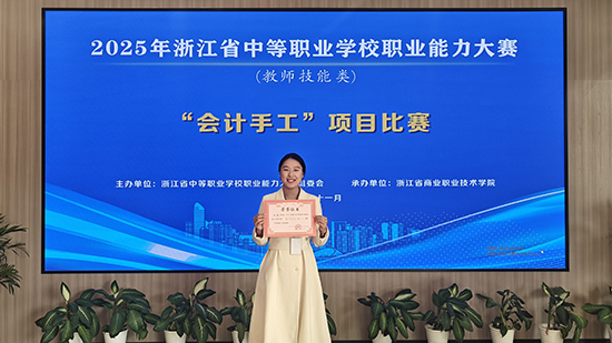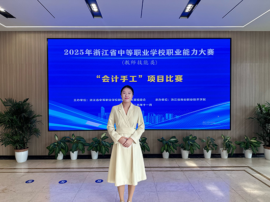 11月2日下午,杭州的决赛赛场传来振奋人心的捷报 —— 在 2025 年浙江省中职学校职业能力大赛中,永康市职业技术学校的张颖老师凭借扎实的专业功底、创新的教学设计与从容的临场表现,从全省各地市30余位精英选手的激烈角逐中脱颖而出,一举夺得“会计手工”项目一等奖,斩获浙江省第一名的佳绩!