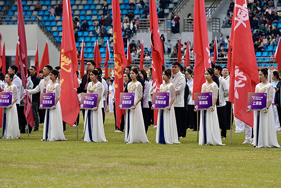 开幕式上,由学校120名男生组成的红旗方队率先吸引了全场的目光。队员们步伐铿锵、身姿挺拔,手中的红旗迎风招展。他们以饱满的精神状态与昂扬的斗志,尽显严肃认真、担当有为的精神风貌。