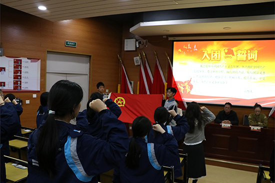 仪式第六项议程:在院团委书记刘非的领誓下,全体新团员举起右拳,庄严宣誓。铿锵有力的誓言回荡在现场,展现了新团员们为共产主义事业奋斗的坚定决心。