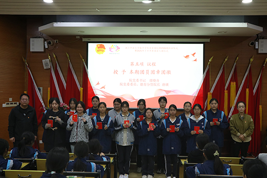 仪式第五项议程:新团员入团环节。院党委委员、德育分管院长唐瑛宣读了新团员名单,共有 75 名同学光荣加入中国共产主义青年团。随后,院党委书记邵晓舟、副院长唐瑛为新团员代表授予团章、团徽。胸前的团徽不仅是共青团的象征,更是一份沉甸甸的责任,时刻提醒着新团员们肩负的使命。